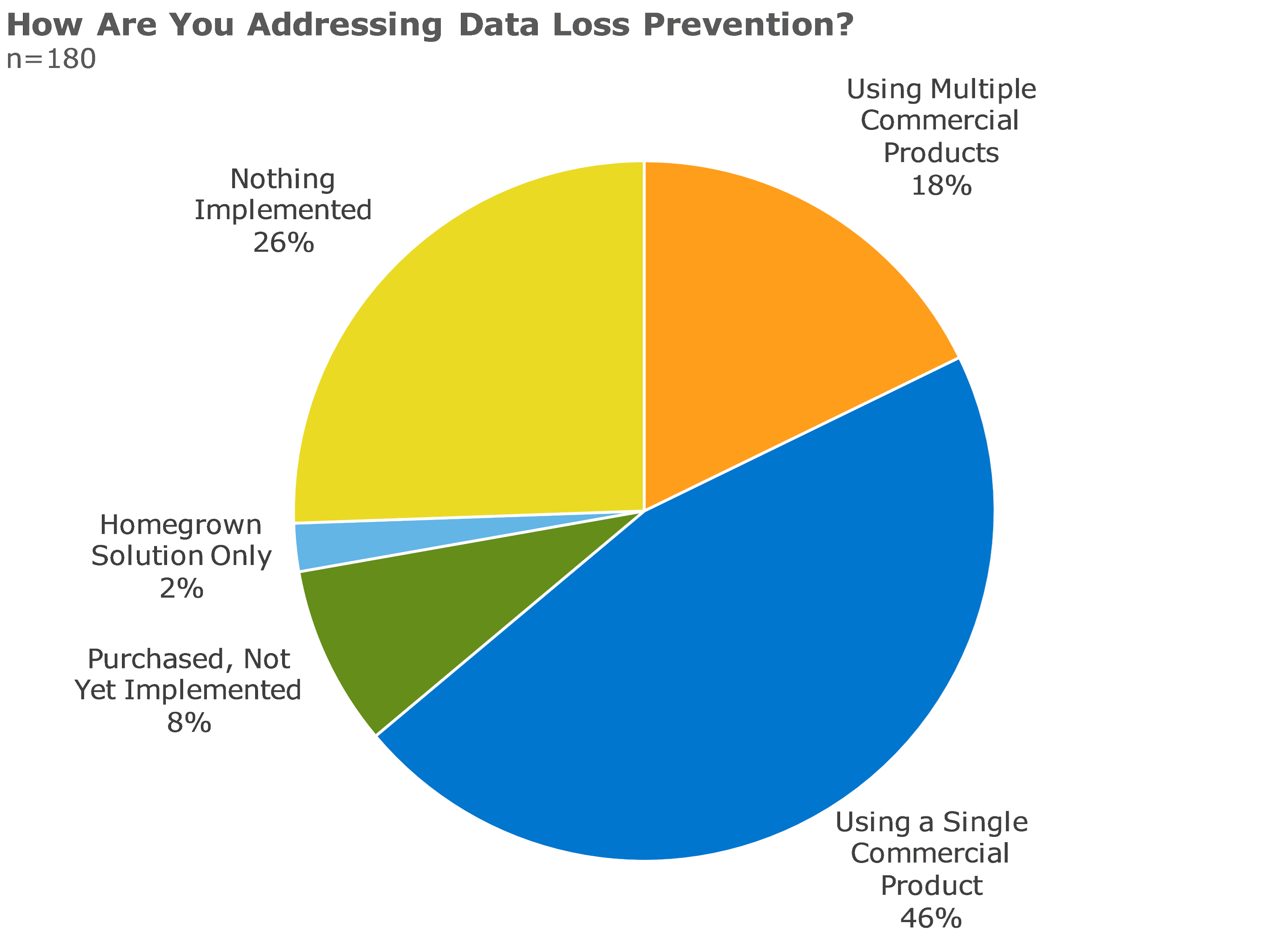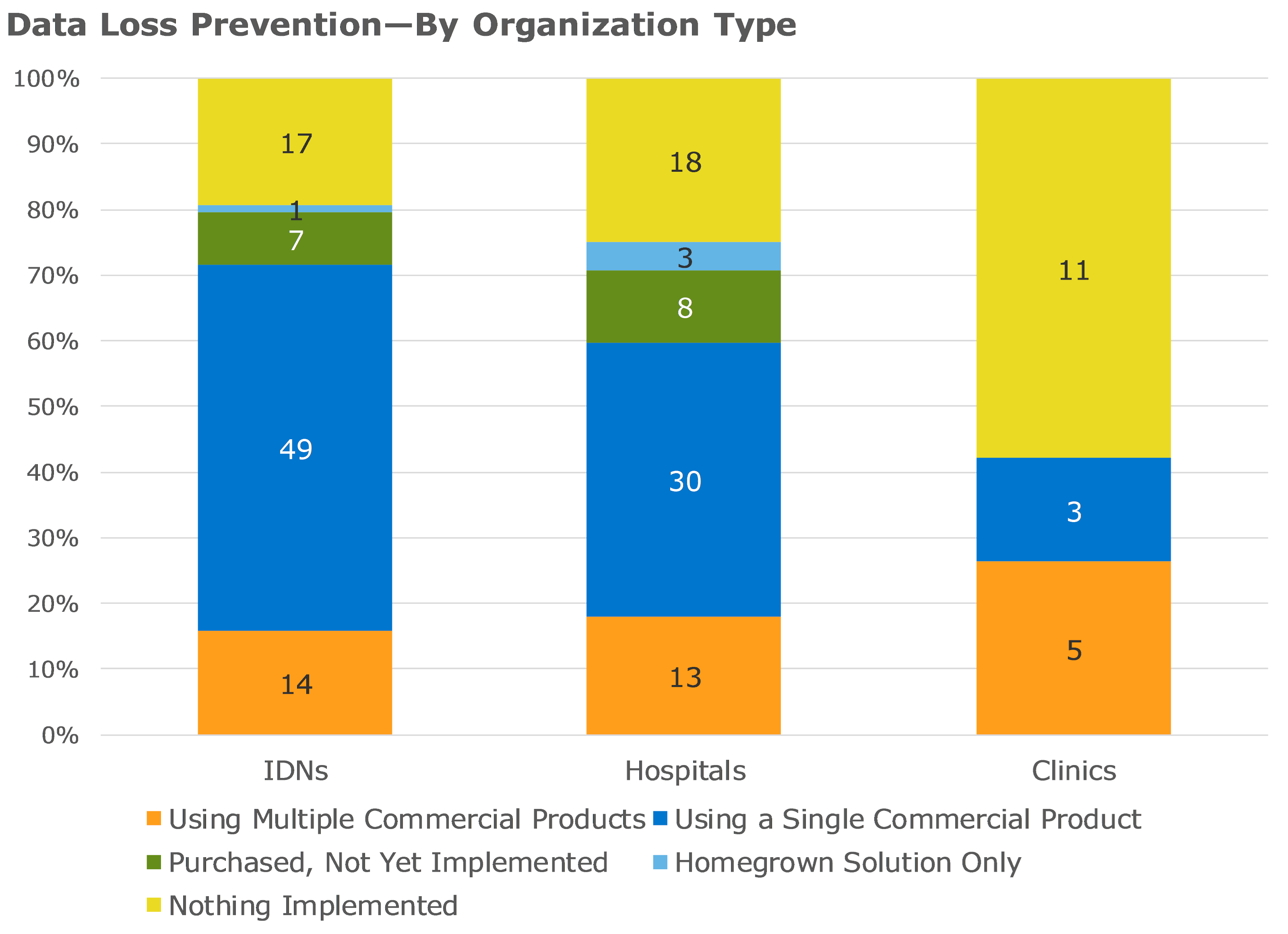 The majority of organizations (with the exception of clinics) have at least one commercial solution in place today, and about one-fifth of organizations leverage multiple commercial solutions to help lock down their sensitive information.
