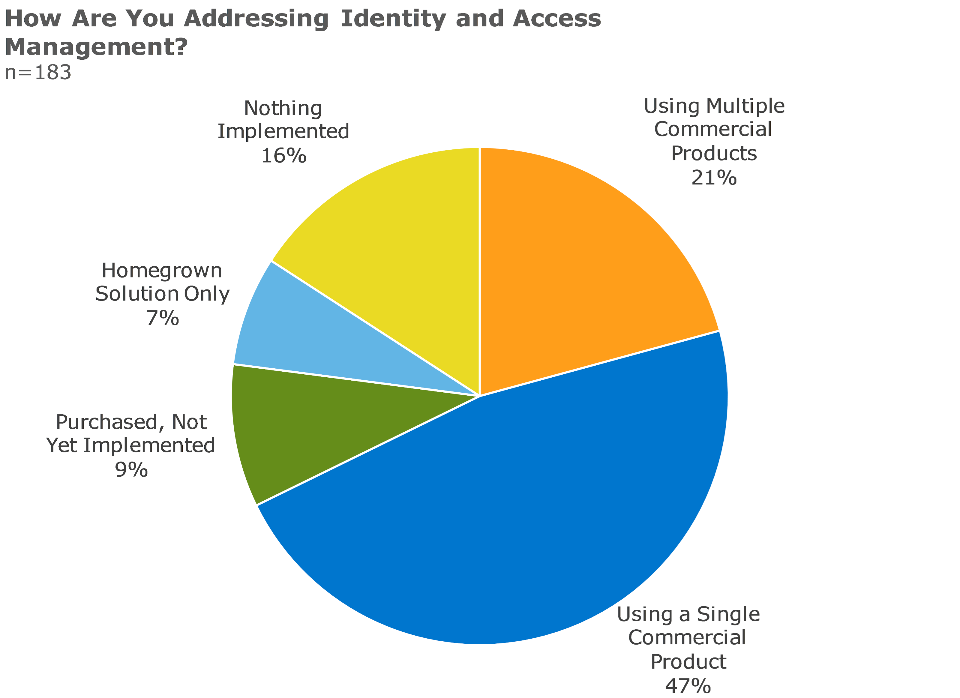 Only about one in 10 healthcare organizations report that IAM is one of the most impactful strategies helping them with their security g oals. The tasks healthcare organizations consider as IAM range from basic provisioning/deprovisioning with Active Directory to single sign-on, two-factor authentication, and biometric scanning in more complex environments. Even though using Active Directory is a more basic approach to IAM, healthcare organizations do count it as an IAM strategy. A number of organizations report that they use only Active Directory or use it in conjunction with other solutions. It is likely that other organizations also use Active Directory as an underlying piece of their IAM strategy but did not mention it when asked about IAM due to its simplicity.