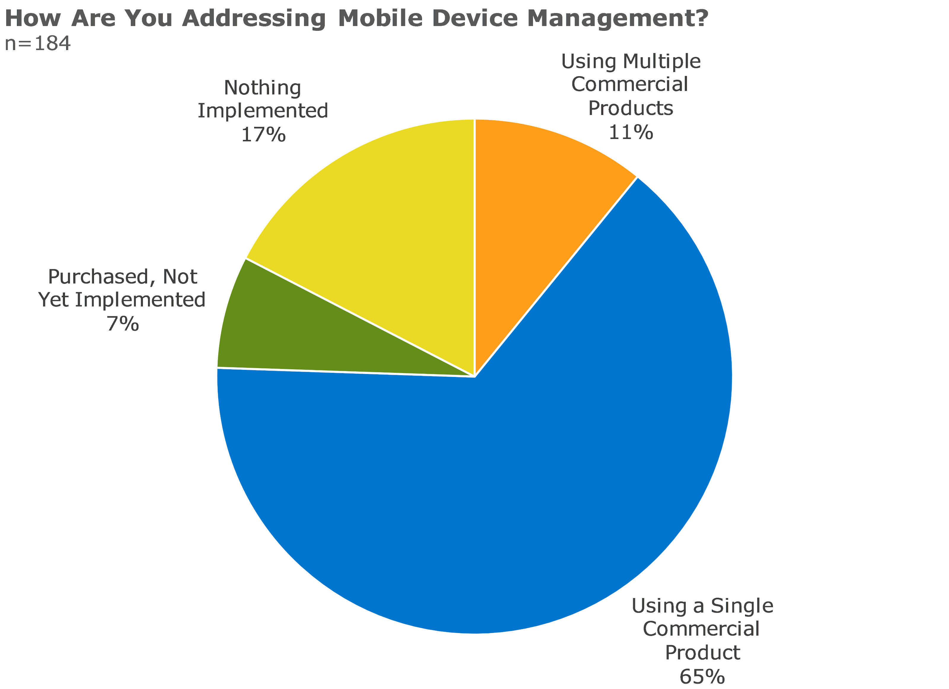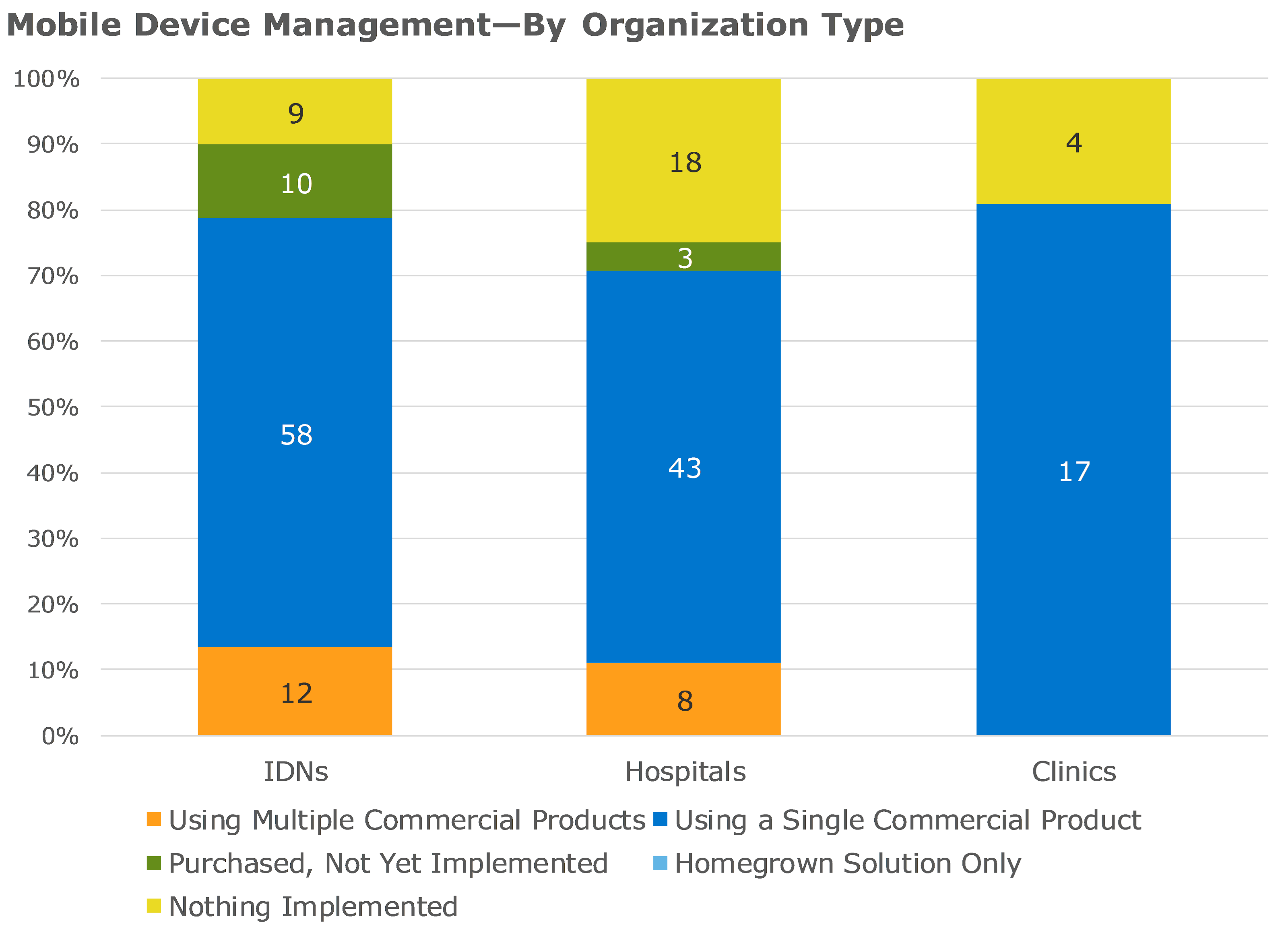 • IDNs and those organizations that self-report as having a fully functional security program are more likely to use device encryption as a method of securing endpoints. In general, organizations often feel that specific MDM solutions help them do better with securing mobile devices; laptops and devices wired into the network are a bigger challenge. One CISO stated,