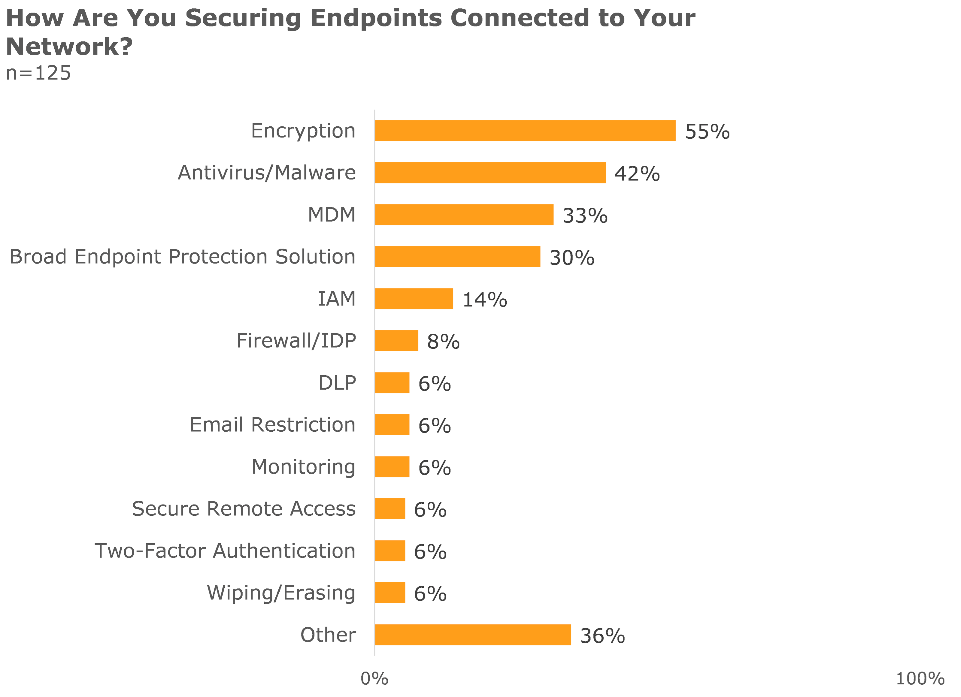 The majority of organizations use a combination of methods to ensure the security of their endpoints, which include both laptops and mobile devices. Security professionals find themselves trying to control for end-user behavior or mistakes, which often cannot be tackled through software alone. Rarely do organizations have single-threaded strategies for endpoint protection.