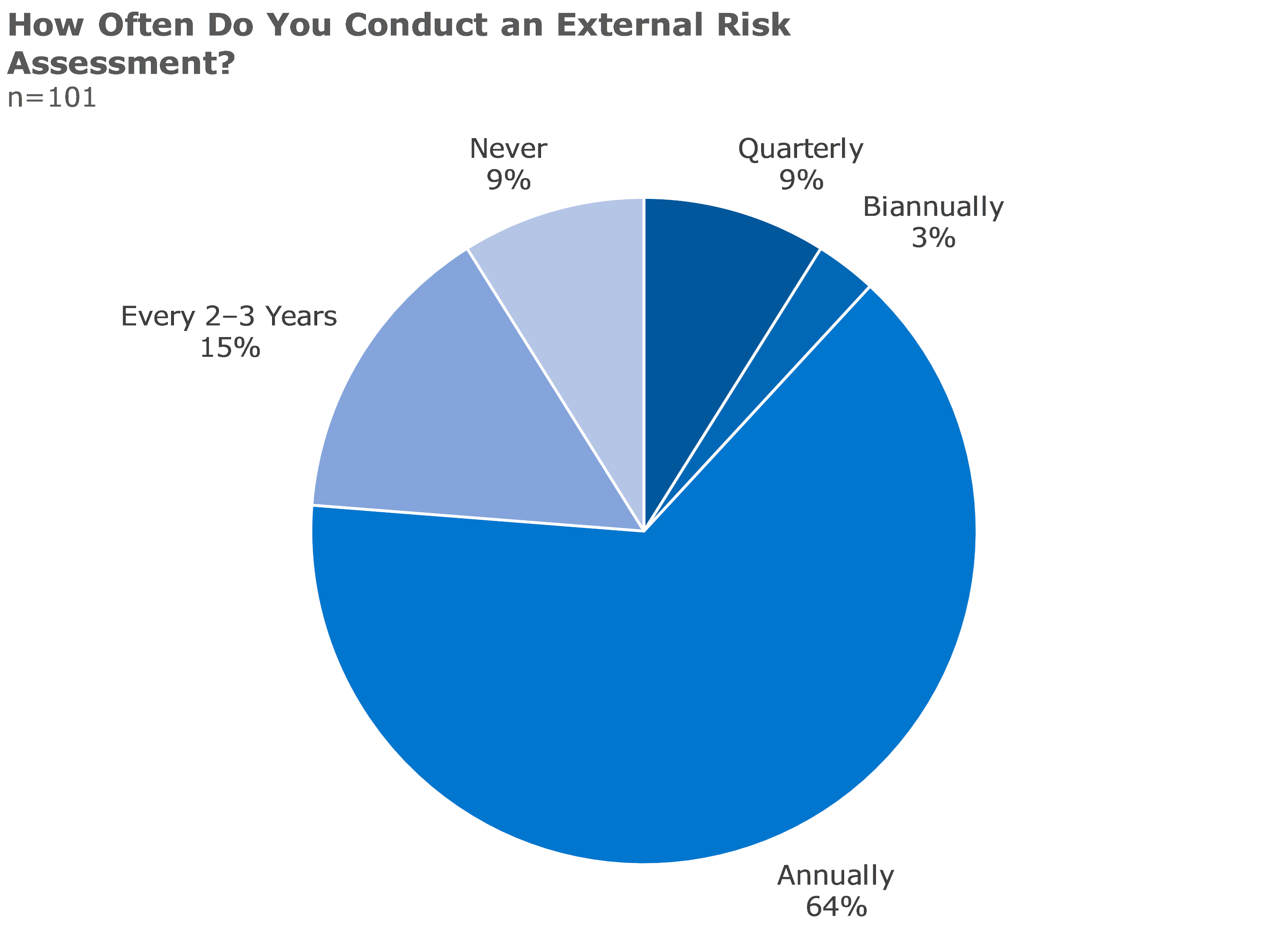 Most organizations conduct an external risk assessment annually through a third-party firm and then have a team or individual follow up and address any vulnerabilities. Those that don’t conduct external assessments have internal assessments. There are no significant differences in this area based on organization size or type.