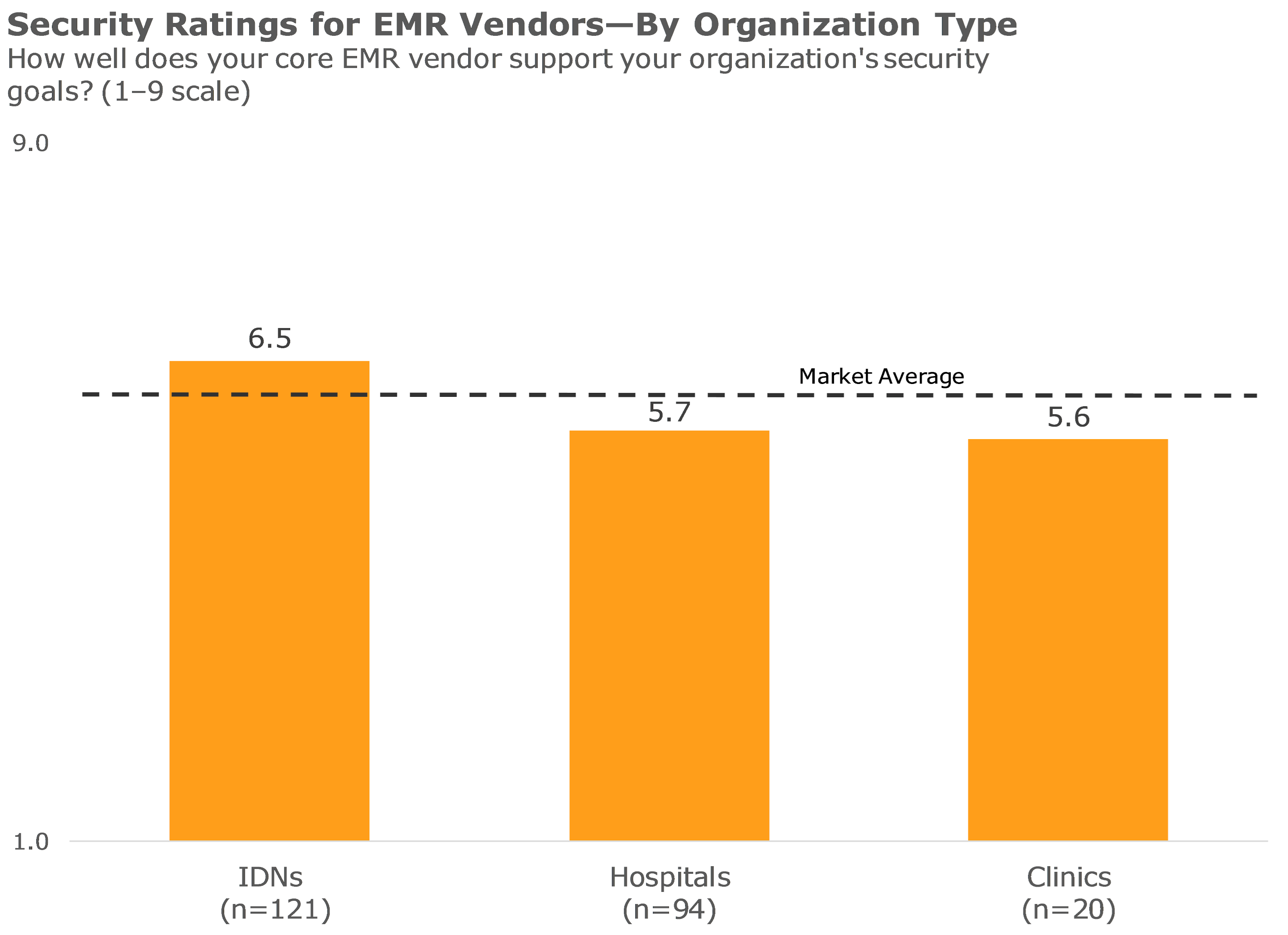 Security professionals are largely underwhelmed by their EMR (electronic medical record) vendors’ focus and strategy around security. Many note that their EMR vendor is very slow to respond to their questions or does not discuss security with them very frequently. Even customers of the leading EMR vendors in the US market report that security is not a top focus for their vendor. The study did not indicate that EMR solutions are vulnerable or that the EMR vendors are not addressing security. EMR vendors all ensure that their data is secure according to HIPAA (Health Insurance Portability and Accountability Act) regulations, and customers note that most vendors are starting to think about security more regularly.