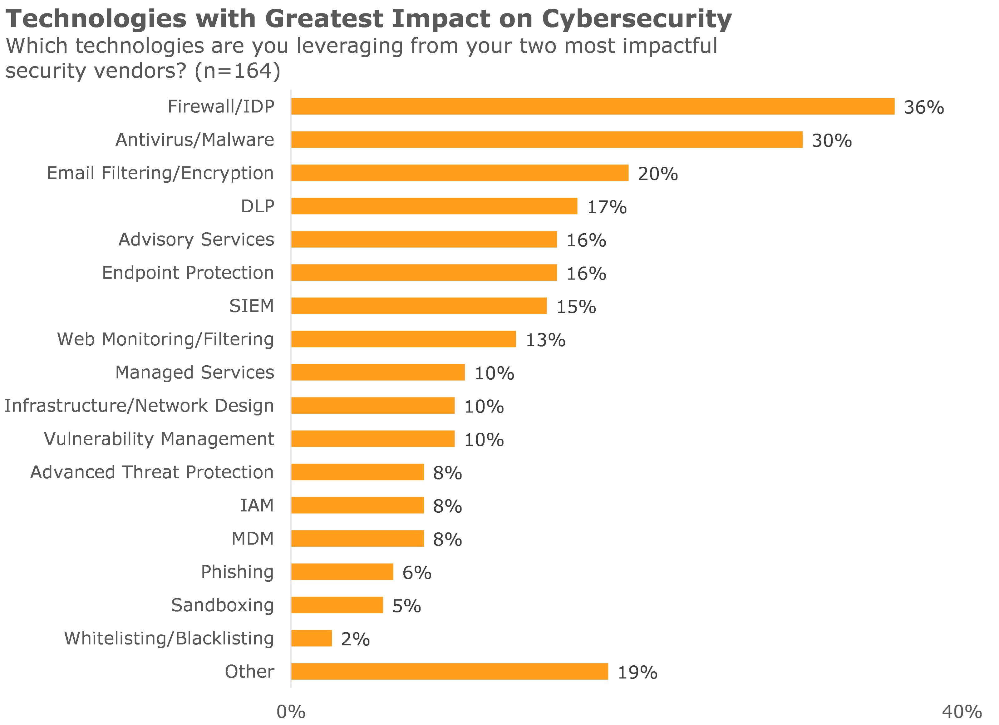 Note: Organizations are often using multiple technologies from their most impactful vendor. “Other” includes analytics, anomalous behavior, anti-bot, asset tracking and scanning, breach detection, cloud hosting, end user training, forensic analysis, gateway access, incident response, log monitoring, multitiered architecture, patch management, phishing training, secure messaging, virtualization, and web proxy..