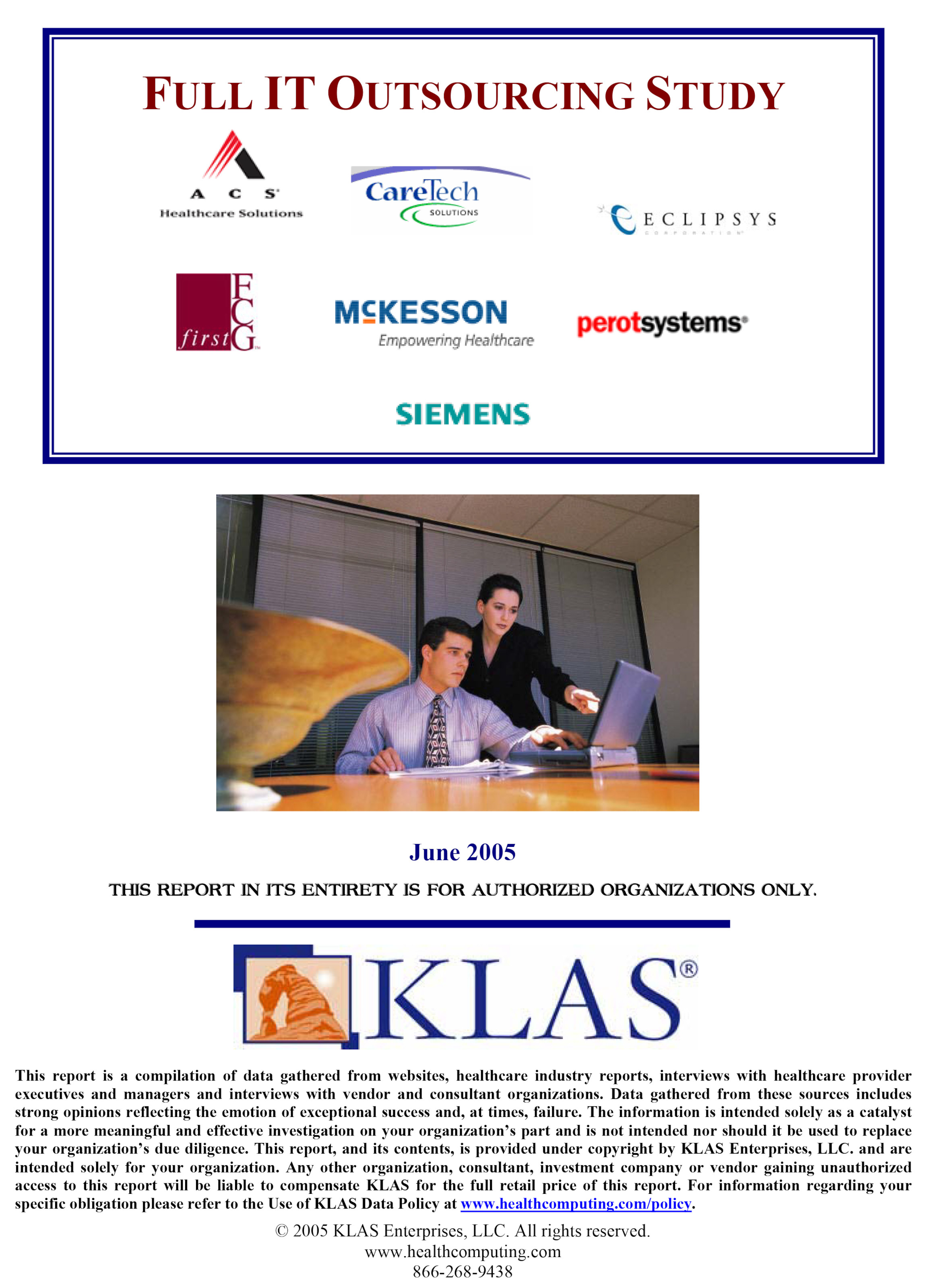 Outsourcing firms included in the main body of the report are: ACS (Superior), CareTech, Eclipsys, First Consulting, McKesson, Perot Systems, and Siemens. Performance data is included in the addendum on CSC and PHNS. Vendor overviews are also included on firms that provide IT outsourcing to the healthcare provider industry.